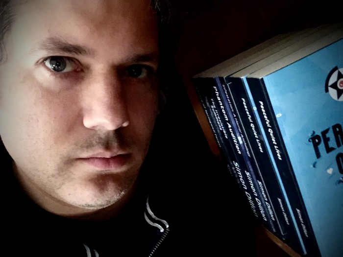Me looking moody next to some of my novels, trying to hide how badly I need a haircut. Photo by author.